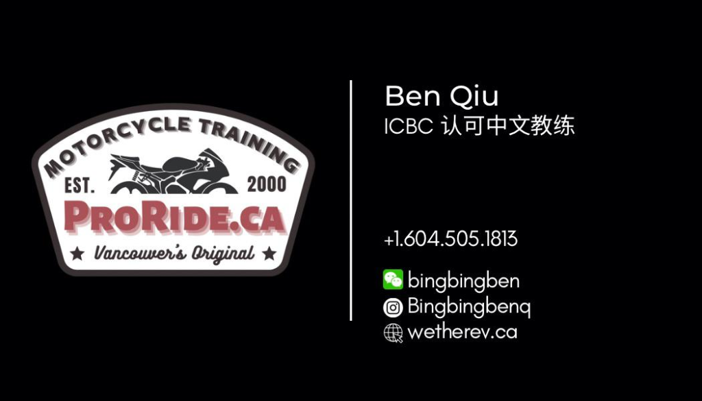 ProRide是温哥华本地一家历史悠久的资深摩托车训练驾校,这个中文课课程导师是Ben。Ben能说国语和粤话,也有参与英文课程的教课。Ben拥有多年骑车经验,而且每年都到赛道训练来提升自己的骑乘技巧以及教学技巧。